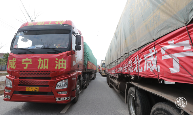 23日上午10点10分,云南54辆装满2842万元物资的货车缓缓驶入咸宁高速马桥收费站,爱心车队出收费站时,执勤点民警自发列队敬礼……这支云南援助咸宁物资车队于21日下午15时从昆明出发,日夜兼程奔波2000公里,安全抵达咸宁。