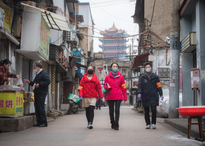 2月7日,武汉市西城壕社区党委书记翁文静与志愿者柳莹、张琦上街进行防疫宣讲。
