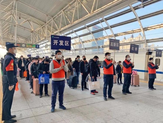 三是开辟绿色通道。为务工人员办理团体车票,在安检、进出站、验票、候车等环节开辟绿色通道,使旅客保持一定间距,避免人员聚集,有序畅通出行。