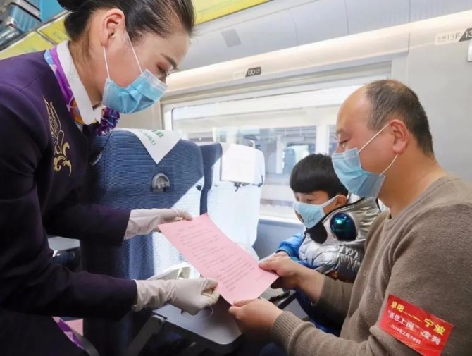 五是做好途中服务。安排在列车上播放防疫常识,向务工旅客发放防疫知识宣传手册,不安排餐车集中就餐,提供扫码订餐服务等。