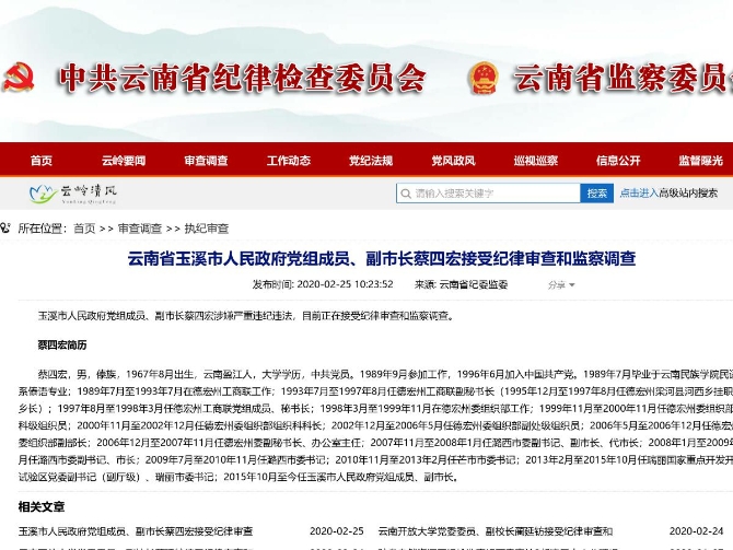 昆明信息港讯 机器人小明 玉溪市人民政府党组成员、副市长蔡四宏涉嫌严重违纪违法,目前正在接受纪律审查和监察调查。