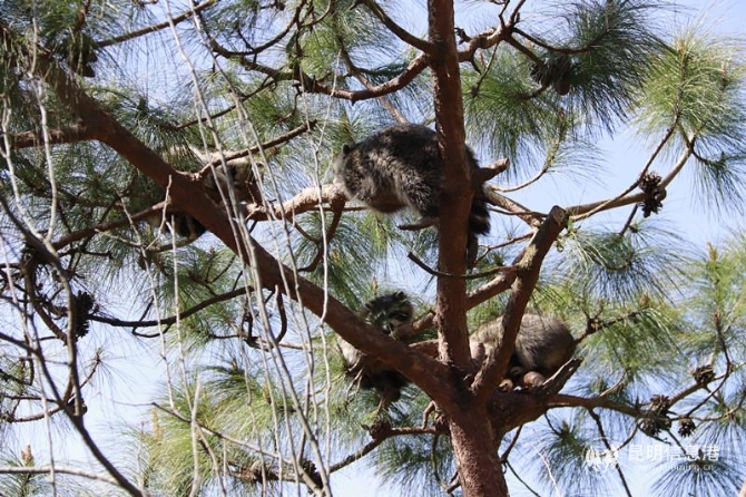 到了下午15点左右,浣熊玩累了,伴着暖暖的阳光,找一棵树爬上去,在最舒服的位置,开始睡懒觉。这时候,只要一抬头,就会看到树上“长出”好多浣熊,饲养员们则在一旁看着,看到它们都很安稳的在树上“窝着”,才安心地去做其他事情。