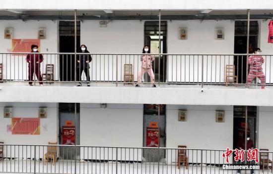 中新社武汉2月29日电 记者杨程晨 29日中午,作为康复期患者隔离点的武汉软件工程职业学院5栋宿舍楼响起了音乐,人们戴上口罩走出房门,站在“口”字型走廊上练起八段锦和太极拳。