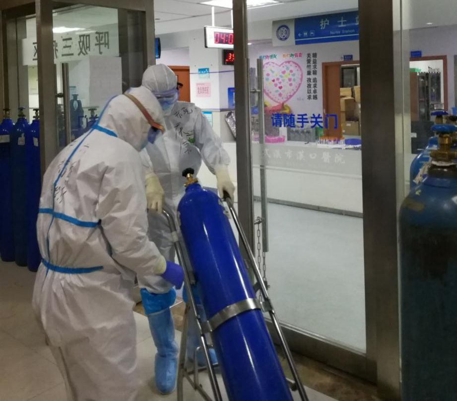 04:00,开始做夜间治疗,指脉氧监测、测血压、更换氧气筒、测体温、给不能自理的患者喂水、记尿量、换大小便后的尿片和床单、观察书写护理记录。发现异常值立刻通知值班医生。核对抽血试管并认真登记,特殊条件下的汉口医院并没有打印或者手写的治疗单,也没有扫码枪,为了防止出错,每个试管的条码需再次在电脑系统上仔细核对。小小的数字看到头晕眼花,但是我们反复双人核对,目的是一定不能出错。高流量和无创呼吸机的患者需要的氧耗量特别大,半个多小时就要换一罐瓶装氧气,我们都笑称这些氧气罐是“大炮”。1瓶装氧气重约为百斤,弱小的我用尽气力也只能挪动一点点,根本搬不到小拖车上。“阿香,我来帮你吧!”每到这时,和我搭班的东莞战友都会来搭把手,帮我一起从病区门口把氧气罐拉到病房,协助我一起更换,每每这时,心中特别感谢,感谢团结一心的战友。