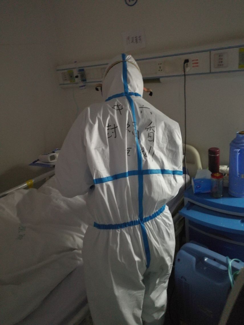 02:10,到达医院呼七病区,换下外套进入清洁区,开始穿戴我们的“盔甲”,为了防止耳朵额头鼻子的压痕,先涂抹赛肤润,再严格按照标准流程,帽子、N95口罩、防护服,一个都不落下,连续20多天的奋战,我们每个人都将防护服的流程烂记于心,干脆利落地迅速穿戴好。为了避免上厕所,有些战友提前穿上纸尿裤。我们两两互相检查,非常严格,不能有一丝纰漏,互相鼓励,用记号笔在防护服上写上名字和加油的话语,提前10min进入病房。