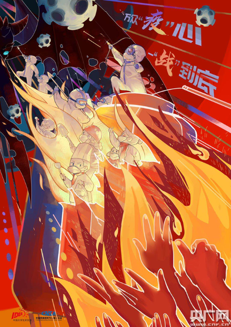 面对疫情,新闻学院的李雨晴用自己独特的方式参与战“疫”,设计海报传递战“疫”精神。在了解了不同行业、不同年龄、不同地域的人们一起努力共同战“疫”的事迹后,李雨晴产生了她的创作灵感——“与疫情战斗的道路并不平坦,各种因素总是在阻碍我们的脚步;但是,总有很多人在前线奋斗,使希望留存。”从她设计的海报中人物造型有很多,医护人员冲锋在前,其他各行各业的人们在后方支持。“我希望通过海报表达所有人齐心协力一定能战胜疫情这个意思。”准00后李雨晴说。