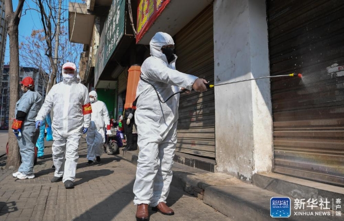 武汉市江岸区花桥街道志愿者在对街区进行消杀作业(2月9日摄)。新华社记者 程敏 摄