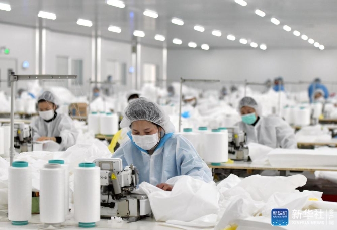 在位于湖北省仙桃市的湖北裕民防护用品有限公司生产车间内,工人们加紧生产医用防护用品(1月28日摄)。新华社记者 李贺 摄