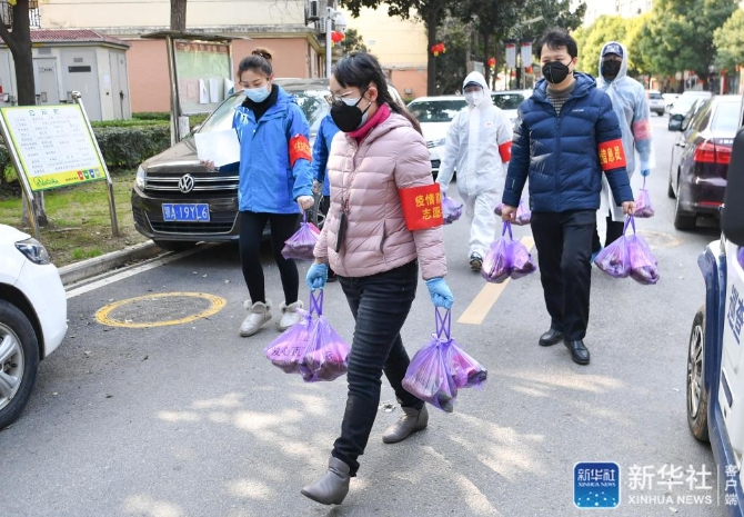 武汉市武昌区华锦社区的志愿者在为社区居民送菜上门(2月23日摄)。新华社记者 程敏 摄