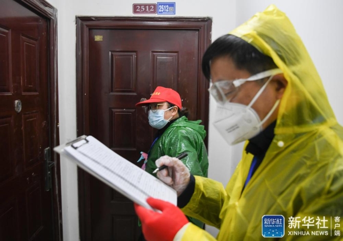 武汉市青山区工人村街道青和居社区网格员李文丽(左)在上门排查(2月18日摄)。新华社记者 程敏 摄