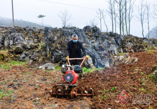 翻过年,再次见到陈万能时,他正在用犁地机翻犁烟地,汗水已浸透了衣服和口罩。陈万能长得黝黑、健硕,操着一口地道西畴壮家方言,典型的西畴农家汉子。