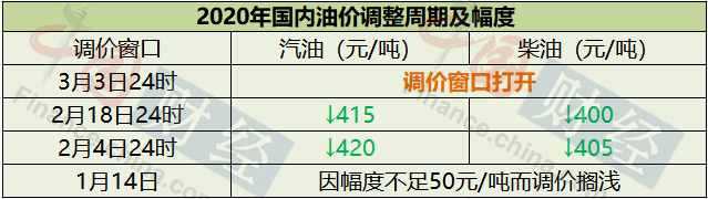 2020年以来,国内成品油已历经三轮调价周期,呈现“1搁浅2跌”,汽油累计下调了835元/吨,柴油累计下调了805元/吨。