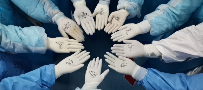 马上有老师要换防了,可能下次休息完就不是我们这一小组了,为了特殊时期的革命友谊,交完班后,我就张罗大家在自己的防护手套上各写一个字,拼成了这样一句话“感恩有你,承蒙遇见,加油!”尽管身穿防护服、带着口罩,看不清彼此的脸,但我知道我们的心始终相连。