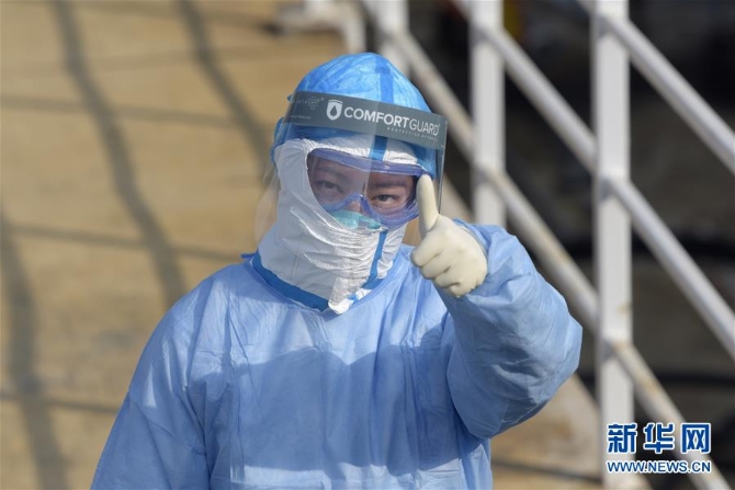 这是2月4日在武汉火神山新型冠状病毒感染肺炎专科医院拍摄的医护人员。 当日,武汉火神山新型冠状病毒感染肺炎专科医院开始正式接诊新型冠状病毒感染的肺炎确诊患者。 新华网发 范显海 摄