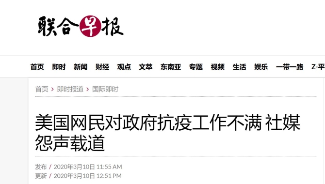 《联合早报》还表示,美国早在上周就因防控工作而受当地民众批评。有媒体此前报道,美国疾病控制中心无法及时出产试剂盒,派发给美国多个州的试剂盒仅百个。在舆论强烈质疑下,美国副总统彭斯5日承认,美国现有的试剂盒不足。较早前,旧金山市长布里德(London Breed)痛斥试剂盒严重短缺是美国的“国家耻辱”。