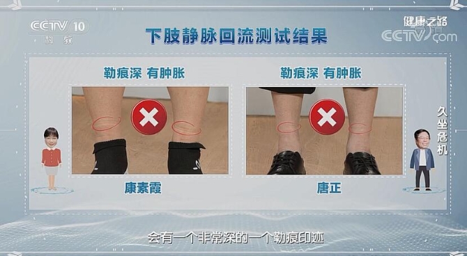 深静脉通畅时,足踝部只会留下浅浅的勒痕。如果下肢出现肿胀,说明有深静脉血栓的风险。