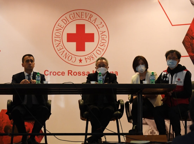 13日中午,中国专家组、中国驻意大使李军华与意大利外交部长迪马约在罗马拉齐奥大区红十字会总部共同出席新闻发布会,并回答意大利记者提问。