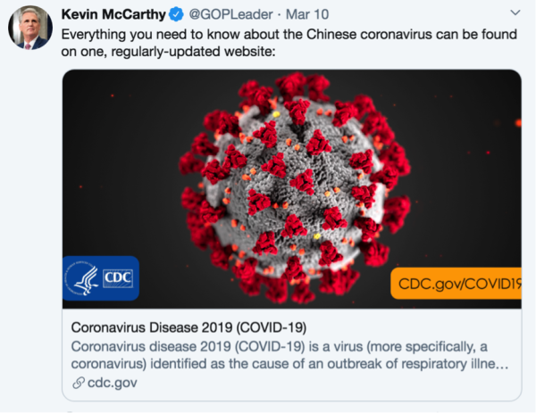 3月10日,美国众议院少数党领袖凯文·麦卡锡在社交媒体上使用“中国冠状病毒”一词。此前,美国福克斯新闻台主持人杰西·沃特斯公然要求中国人为新冠肺炎疫情“正式道歉”。美国国务卿蓬佩奥在接受媒体采访时多次将新型冠状病毒称为“武汉病毒”。由于曾与一位确诊人士有过接触,美国众议院议员保罗·戈萨拉3月8日在社交媒体上宣布将自我隔离14天,他将新冠病毒再次称为“武汉病毒”。