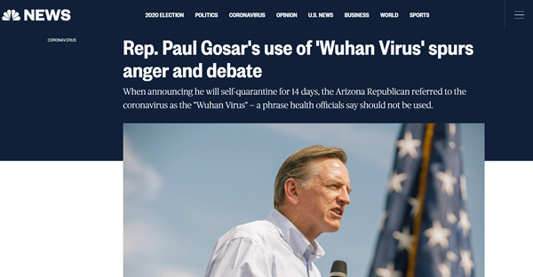 美国全国广播公司(NBC)报道,因将新冠病毒称为“武汉病毒”,美国众议院议员保罗·戈萨拉遭到民众痛斥。