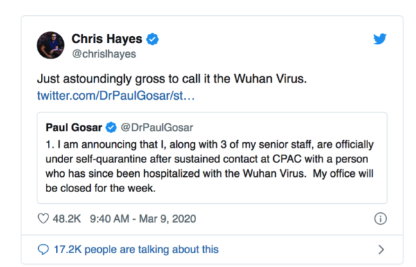 对于戈萨拉在推文中提到“武汉病毒”一事,微软全国广播公司节目(MSNBC)主持人克里斯·海耶斯(Chris Hayes)在社交媒体直呼:“这种说法令人感到恶心。”
