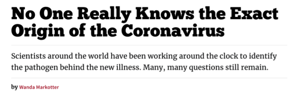 文章指出,世界各地的科学家一直在努力寻找新冠病毒的起源,目前存在许多问题尚未解决,最关键的是目前仍没有掌握关于病因来源的明确数据。