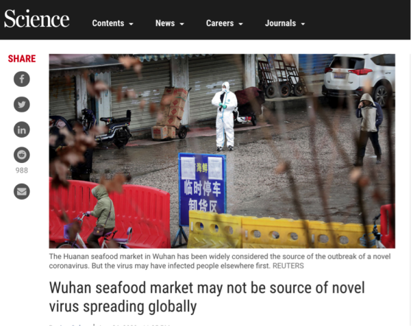 《科学》杂志1月26日发表一篇题为《武汉华南海鲜市场可能并非新型冠状病毒发源地》文章。文中援引美国乔治敦大学传染病专家丹尼尔·卢西(Daniel Lucey)观点:“13个人和这个市场没有任何联系。这不是个小数字。”他认为,如果数据真实准确,那么最早的感染可能发生在去年11月。因为在感染和症状出现之间有一段潜伏期。他表示如果是这种情况,新型冠状病毒最初可能源自其他地方,在人群中悄无声息地传播,12月下旬出现华南海鲜批发市场的大量病例。