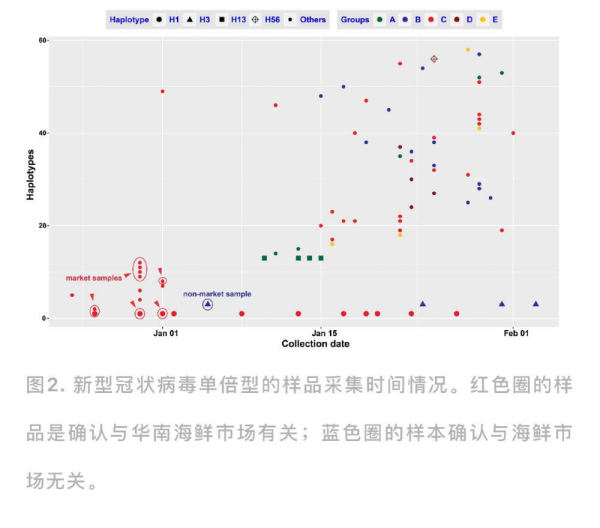 中国科学院西双版纳热带植物园等机构研究人员以预印本形式发布论文,他们收集了覆盖四大洲12个国家的93个新型冠状病毒样本的基因组数据(截至2月12日),通过对全基因组数据解析后发现,收到的样本包含58种单倍型,可以归纳为五组,包括3个古老的超级传播者单倍型(H1, H3和H13)和2个新的超级传播者单倍型(H56和mv2)。与华南海鲜市场有关联的患者样本单倍型都是H1这一类型或其衍生类型,而H3、H13和H38等更“古老”的单倍型来自华南海鲜市场之外,再次印证了华南海鲜市场的新冠病毒是从其他地方传入的观点。
