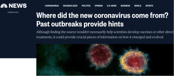 美国全国广播公司(NBC)2月28日发表题为《新型冠状病毒来自哪儿?之前的暴发给出一些提示》报道,文中援引英国雷丁大学病毒学教授伊恩·琼斯(Ian Jones)观点称,早期研究表明该病毒与马蹄蝠中携带的已知冠状病毒非常相似。但尚不清楚的是,病毒如何从蝙蝠中转移到某个或多个中间宿主,最终进入人体的。