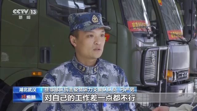 驻鄂部队抗击疫情运力支援队队员 刁严男:小武这同志责任心比较强,对自己的工作差一点都不行。我记得2月15日,雨夹雪,特别冷,我看小武身体比较单薄,我让他待在车上,他怎么都不干,车上车下一趟又一趟,一直到任务完成。