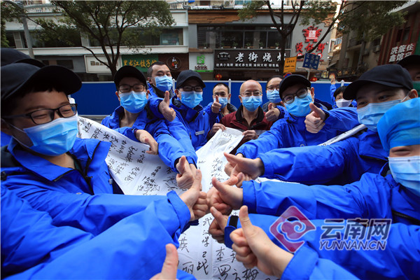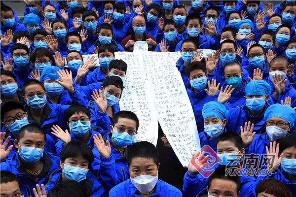 云南第六批援助湖北医疗队原地休整待命,队员们将名字写在“战袍”上合影。