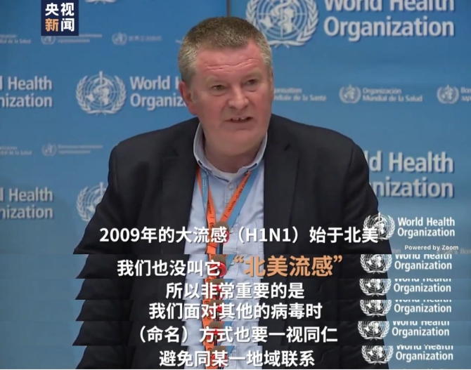 2009年(H1N1)流感大流行是始于北美,我们也没把它称作“北美流感”。所以当遇到其他病毒时,我们采用同样的(命名)方式,避免同地域联系。我们要求每个人在这一刻都抱有团结的想法,这是需要事实并一起抗击病毒的时刻,而不是责怪谁。