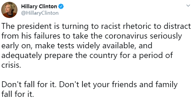 希拉里:总统(特朗普)正在转向种族主义言论,以转移人们注意力,(掩盖)他未能及早认真对待新冠病毒、未能广泛提供检测、未能为美国应对危机做好充分准备。不要上当了,不要让你的朋友和家人上当。