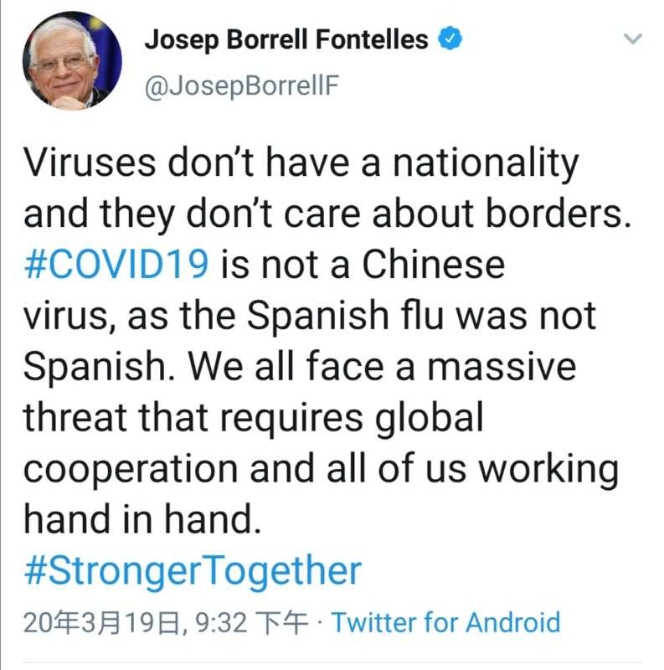 欧盟外交与安全政策高级代表 博雷利:病毒没有国籍,也没有边界。新型冠状病毒(COVID19)不是“中国病毒”,就如同“西班牙流感”,它并不是西班牙的流感。我们共同面对巨大的威胁,需要全球合作,所有人共同携手应对。(央视新闻)