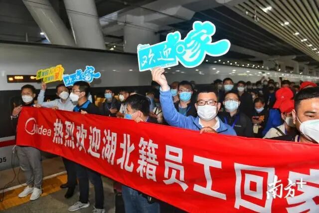 21日晚,佛山多家企业的工作人员早早就在月台拉开横幅,等待接员工“回家”。此次返岗的湖北荆州籍务工人员将回到美的集团、溢达纺织、新宝电器、博智林机器人、伊戈尔电气、群志光电、华昌铝厂等多家企业工作。其中超过一半为美的集团所属公司员工。