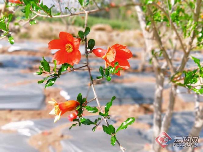 春日无言,以花为信。三月的元谋,石榴花竞相绽放,火红的花朵如一簇簇火焰在风中摇曳,好似一群翩翩起舞的仙子,蔚为壮观。