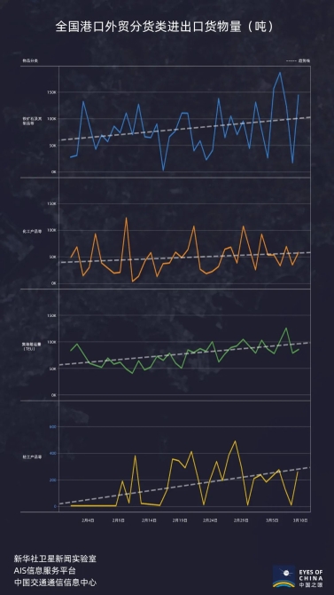 通过卫星等方式获得的中国沿海、内河船舶轨迹(不含港澳台地区),3月中旬相比2月下旬,渤海湾至长江口,以及北部湾区域,船舶航迹明显扩展,说明船舶出港、航行的活跃度大大提升。