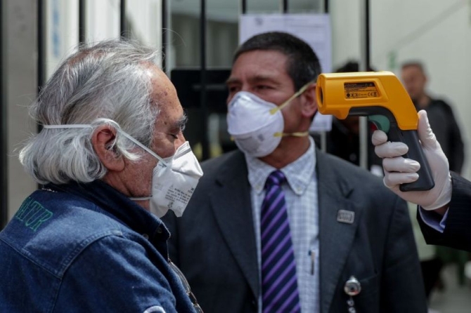 3月17日,在墨西哥首都墨西哥城,工作人员(左)在进入墨西哥参议院前接受体温检测。新华社发(弗朗西斯科·卡涅多 摄)