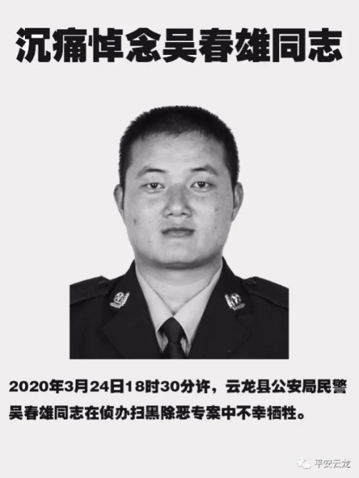 据云南大理州云龙县公安局通报,2020年3月24日下午18时30分许,云龙县公安民警吴春雄在侦办扫黑除恶专案中不幸牺牲,年仅39岁。