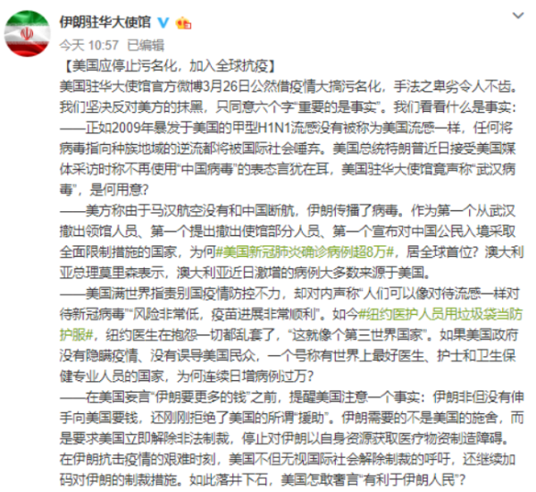 针对@美国驻华大使馆 26日对伊朗的指责,27日,@伊朗驻华大使馆 发表题为“美国应停止污名化,加入全球抗疫”的文章,也用了4个事实予以反击: