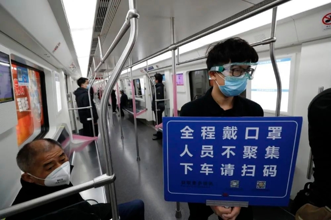 3月28日,武汉轨道交通部分线路恢复运营。这是一名“随车安全员”在武汉地铁2号线车厢里巡视。新华社记者 沈伯韩 摄