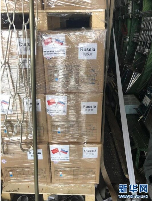 莫斯科时间4月2日4时40分,运载援助货物的俄方货机抵达莫斯科,俄工贸部代表俄政府接收这批物资并送往俄国家外科医疗中心。据中国驻俄罗斯大使馆消息,这批物资总重约25.5吨,其中包括医用口罩、防护服、外科手套、体温计、鞋套等。物资包装箱上用中文和俄文写着“病毒必将被击败,胜利属于我们!”的标语。