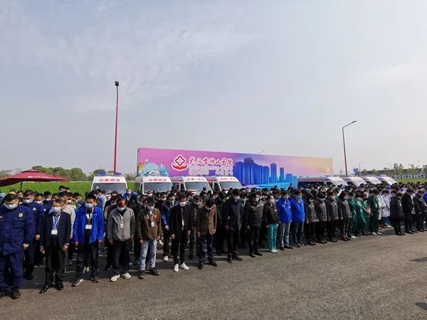 武汉雷神山医院举行哀悼活动,运营单位中南医院和维保单位中建三局一公司工作人员集体参加哀悼。(中建三局一公司供 谢沛霖 摄)