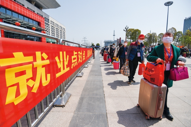 农民工是我国产业工人的主体。要建立健全农民工返岗务工沟通协调机制,加强输出地和输入地信息对接、运输对接、健康检测对接,畅通“点对点、一站式”复工服务通道,推动疫情防控期间务工人员安全有序返岗。图为2020年3月19日,湖北省首批务工人员返岗就业专列从荆州火车站出发,外出务工人员正在进站乘车。 人民图片 黄志刚/摄