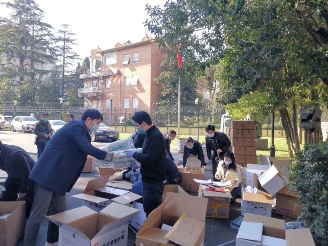 连日来,使馆尽力筹集到2万个口罩、4500盒连花清瘟胶囊等防护物资,作为首批防疫“健康包”,通过快递寄送给意大利境内40多个中国学联分会,再由他们分发给当地中国留学生。第二批和第三批“健康包”也正在发放中。