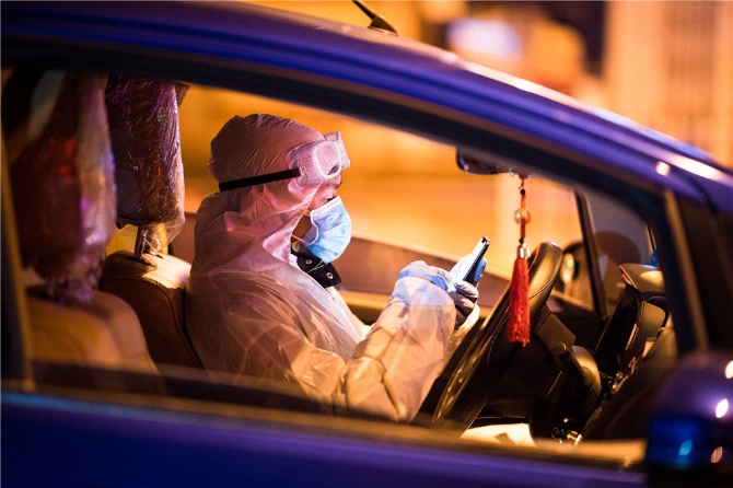 2月29日凌晨,在湖北武汉,志愿者王震在车内查看导航。新华社记者肖艺九摄