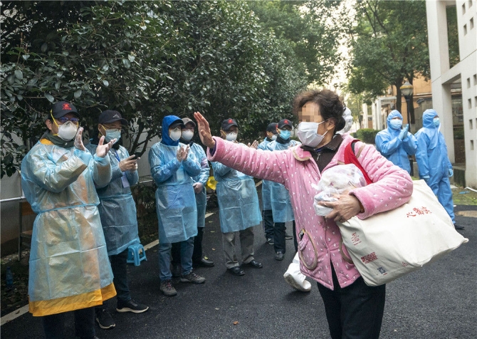 3月10日,在武汉软件工程职业学院康复驿站,143名治愈出院后的新冠病毒肺炎患者,在此进行14天医学观察后,达到医学标准,成功解除隔离。这是解除隔离的治愈患者走出康复驿站后对工作人员表示感谢。新华社记者 熊琦 摄