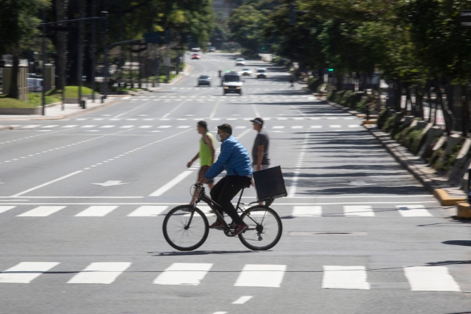 3月20日,在阿根廷布宜诺斯艾利斯,一名戴着口罩的男子骑车经过七月九日大道。新华社发(马丁·萨巴拉摄)