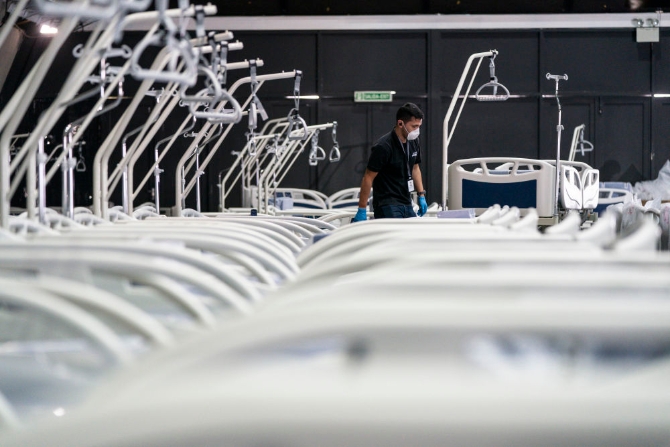 3月24日,在智利首都圣地亚哥,工人在列斯科会议中心改造成的临时医院安置病床。新华社发(智利总统府供图)