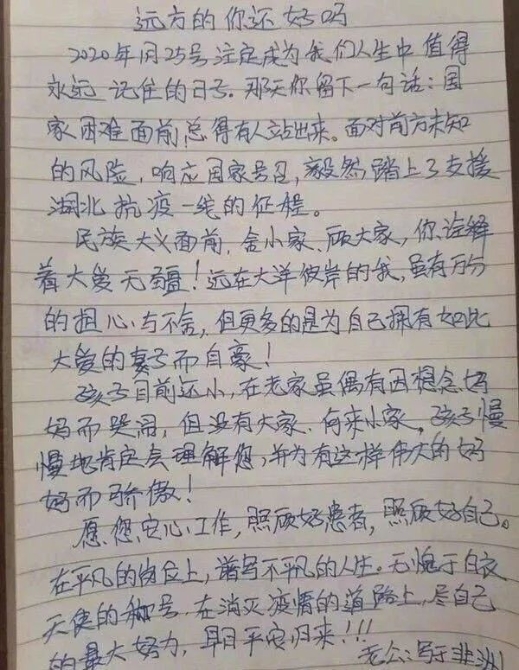 车队出发去机场,群众自发送行的队伍让人动容,马路两旁、居民楼上有无数欢送横幅: “春风十里,只为送你”“谢谢您为我们负重前行,谢谢您曾为黄冈拼过命”“我未谋您面,但是记得您”……黄冈市民拿出了最高的礼节来欢送我们,人群中还有咿呀学语的孩童,由父亲举到头顶,对我们说: “齐鲁大爱,铭记终生,感谢山东,感恩有你。 ”还有多才多艺的小学生画给我们的画,告诉我们,要以我们为榜样,长大后也要做我们这样的人,把正能量带给黄冈少年。 我觉得两个月的困难、艰苦,意义非凡。