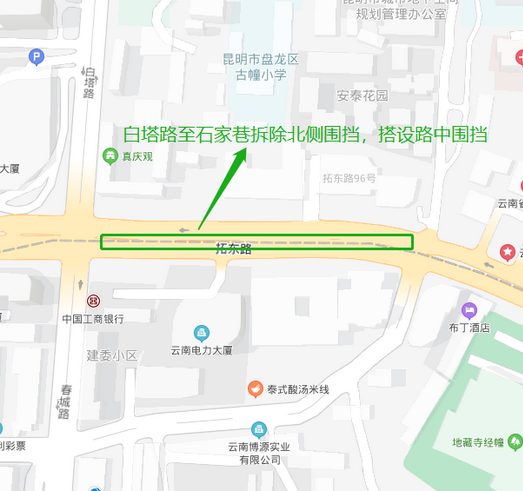围挡搭设后道路通行断面减少,为减小金碧路通行压力,保证施工期间的通行需求,经交警部门审批,将于2020年4月11日开始,对拓东路东向西方向的市博物馆公交站临时移位至昆明市规划展览馆门口进行停靠,共涉及6条公交线调整。白塔路至拓东大厦段路中围挡施工期间,需在市博物馆公交站乘坐以下6条公交路线的市民,可往西前行100米至市规划展览馆门口乘行或换乘。